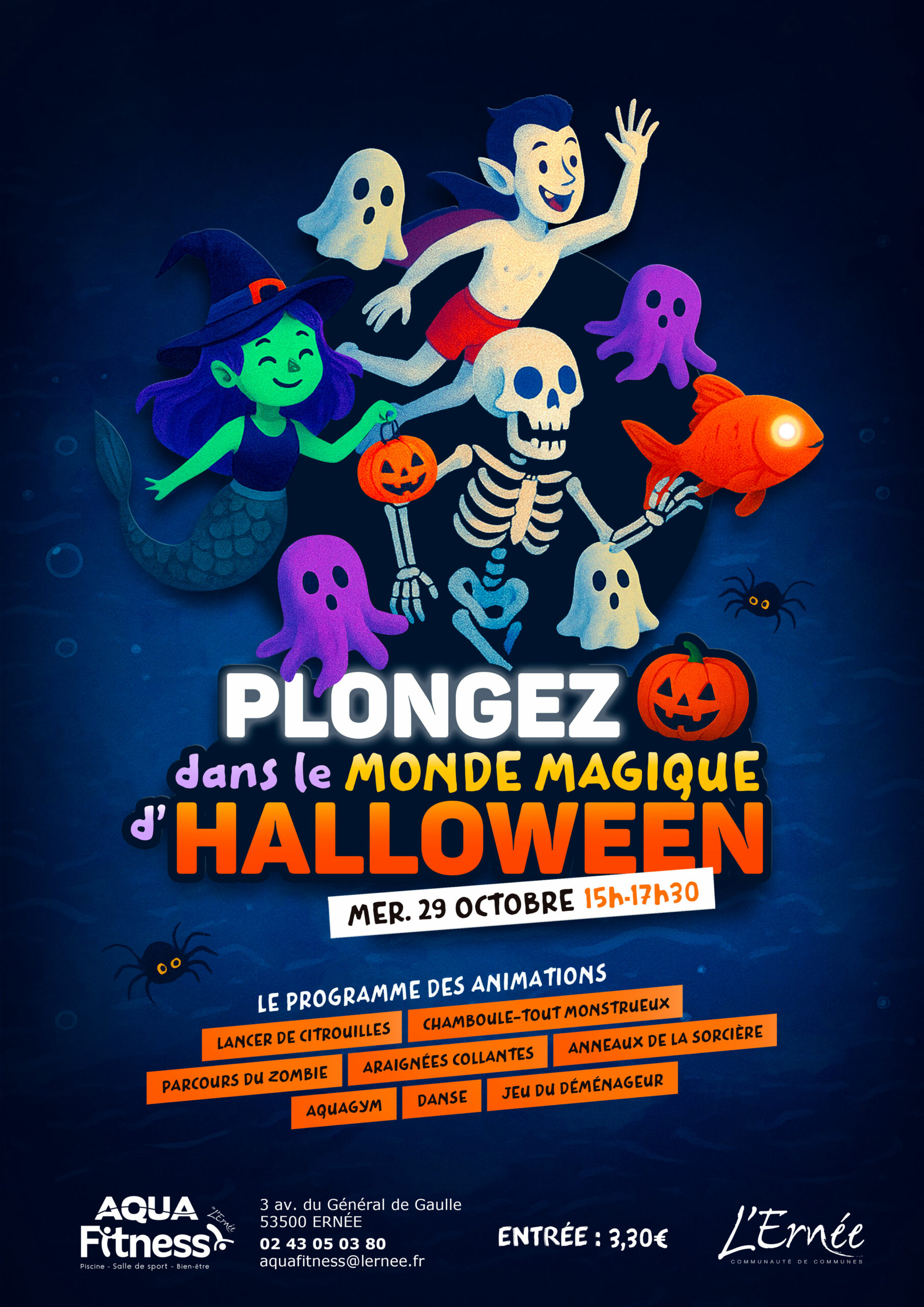 Mercredi 29 octobre 2025De 15h00 à 17h30En libre accès (entrée piscine obligatoire : 3,30 €) Plongez dans l’univers magique d’Halloween pour une après-midi remplie de